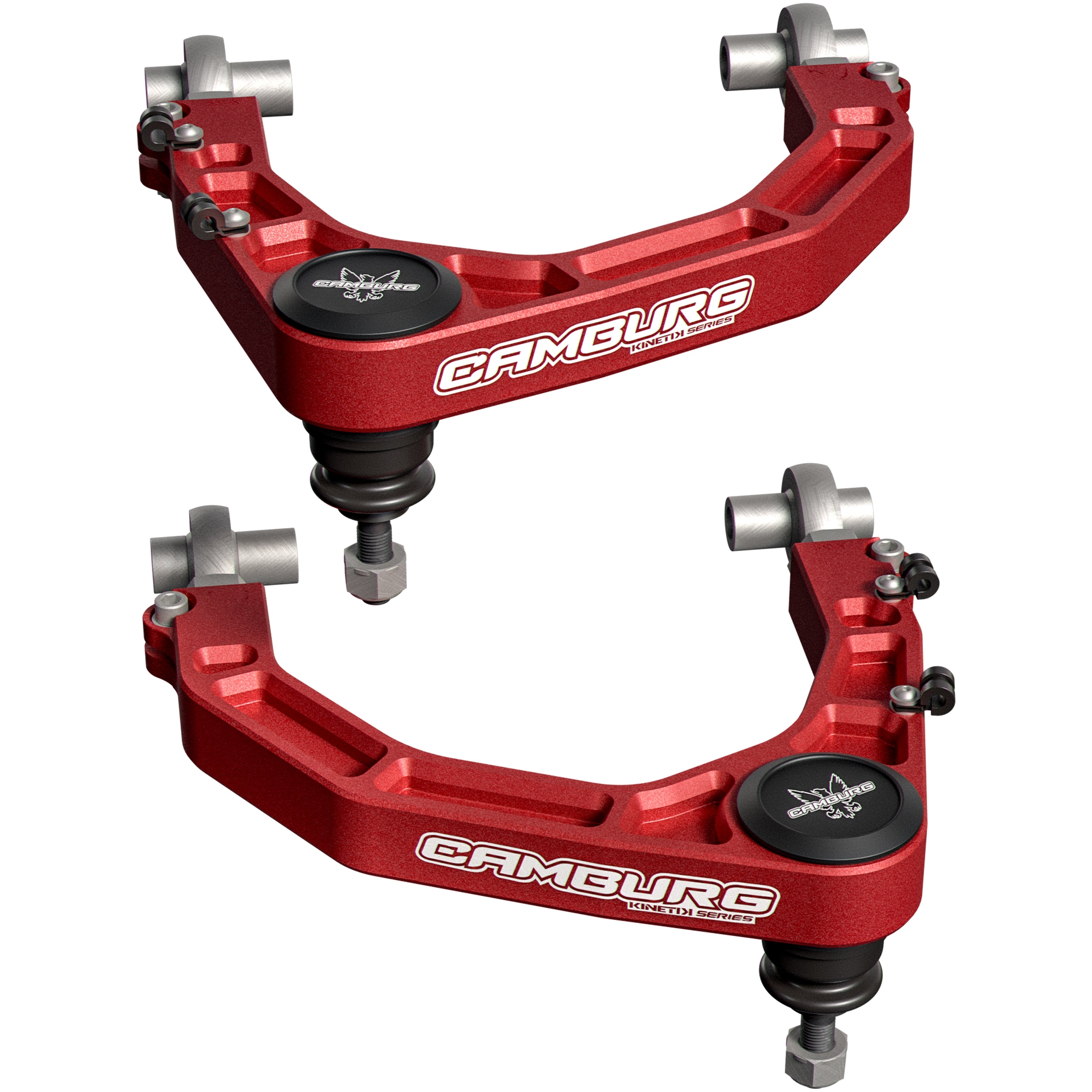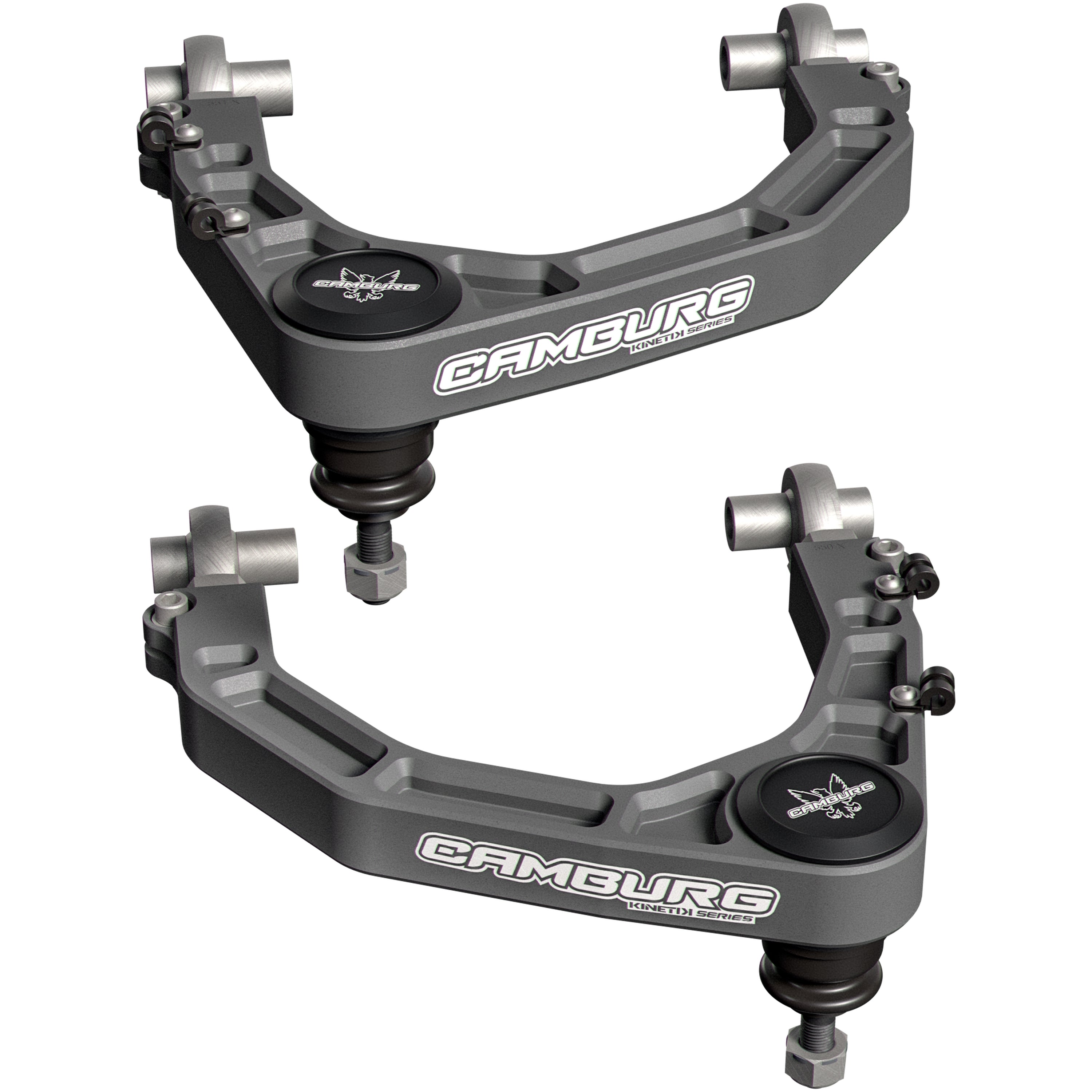 The arms are finished in a refined gunmetal gray, bead-blasted and Type II anodized, with laser-etched logos. All necessary mounting hardware is included. Designed to work with 1-3″ of front lift and compatible with aftermarket coilover systems.