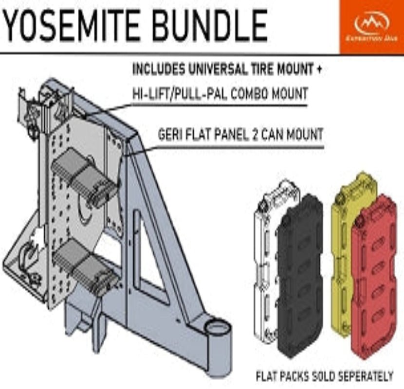 • Yosemite - 1x Universal Tire Mount, 1x Geri Flat Panel Dual Can Mount (Mount+Latches Only to hold 2 Cans), 1x Hi-Lift/Pull-Pal Combo Mount