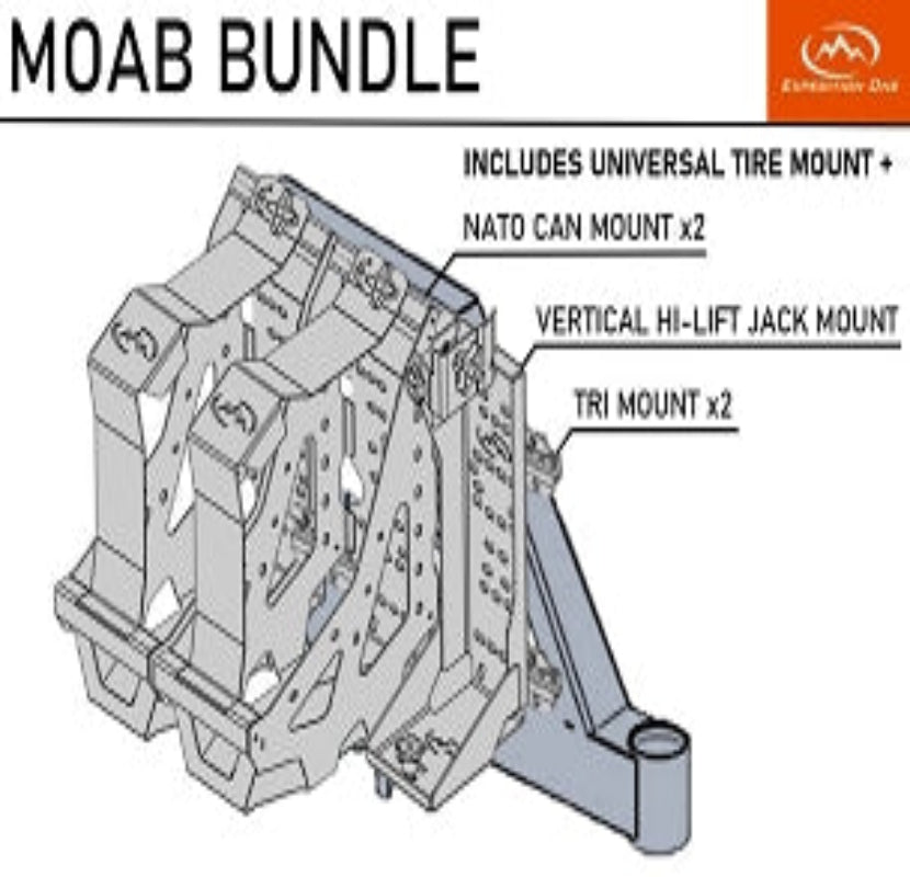 • Moab - 1x Universal Tire Mount, 2x NATO Scepter Can Mounts, 1x Tri-Mount Bar, 1x Vertical Hi-Lift Jack Mount