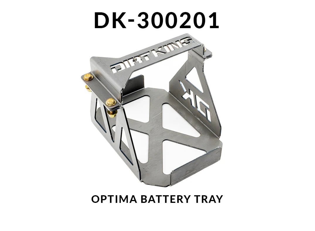 The Dirt King Battery Tray is designed to securely mount your battery in off-road and performance vehicles. Precision-cut from 12-gauge mild steel, it provides a stable platform that prevents battery movement during extreme driving conditions. Compatible with Optima 34/78 and Interstate MTZ-750T batteries, this tray ensures a perfect fit and reliable battery placement.